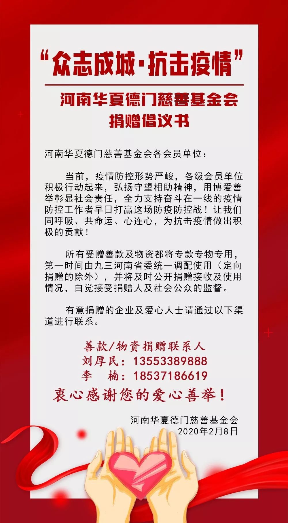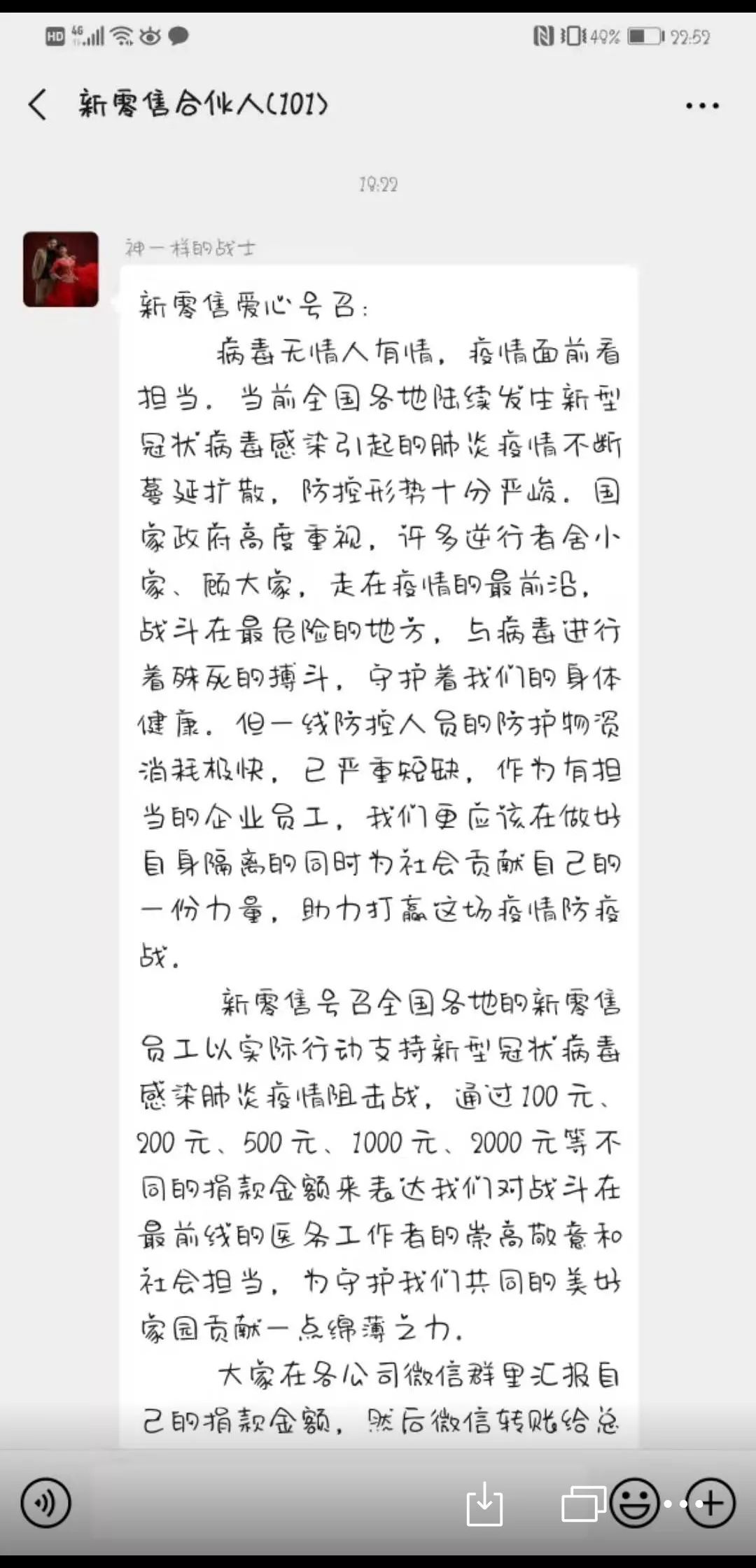 新零售联盟作为一个有着社会责任感的健康行业平台,积极响应国家、地方政府和华夏德门慈善基金会理事长,九三学社河南省委企业家委员会社会公益专业委员会主任王新瑞的号召,主动作为,在做好联盟成员企业和人员疫情防控工作的同时,向全体干部、员工发起了“众志成城,抗击疫情”支援湖北、自愿捐款的倡议。