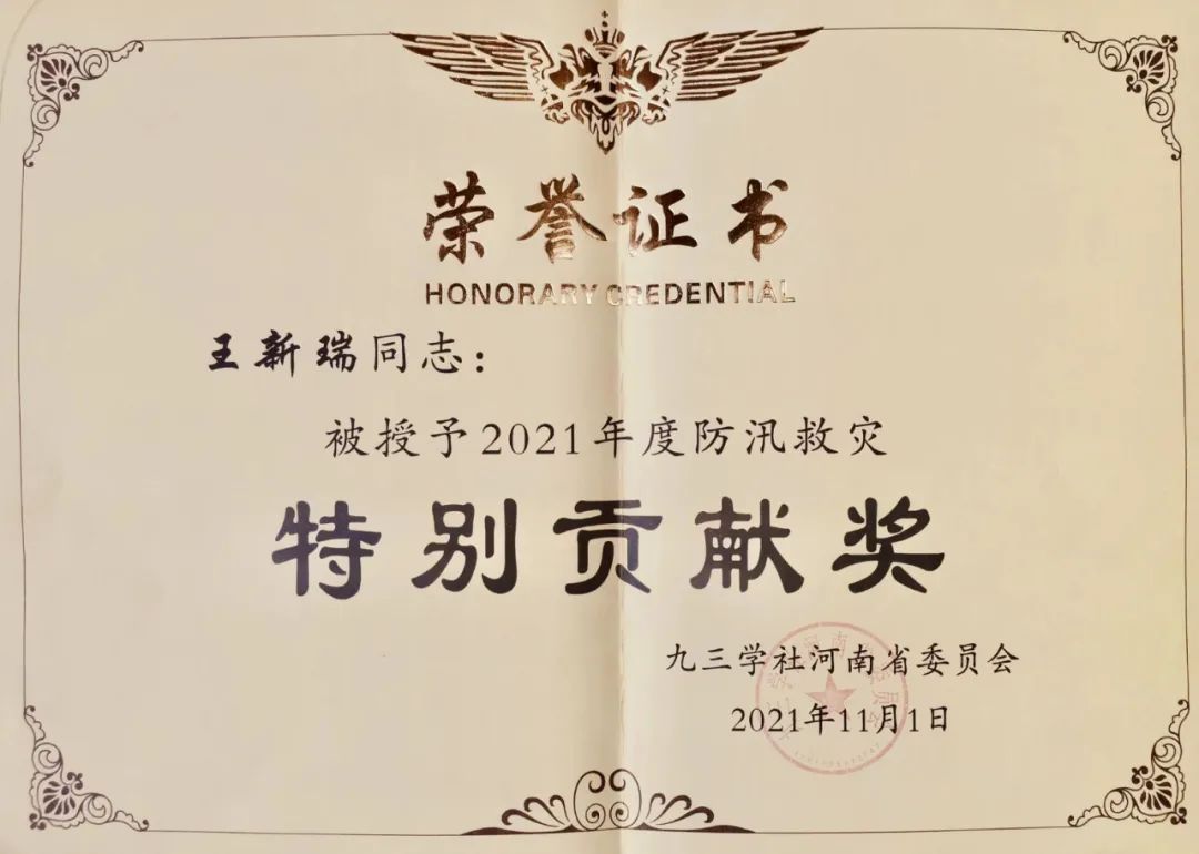 心中有爱 行中有善 | 王新瑞先生获九三学社河南省委员会“2021年度防汛救灾特别贡献奖”